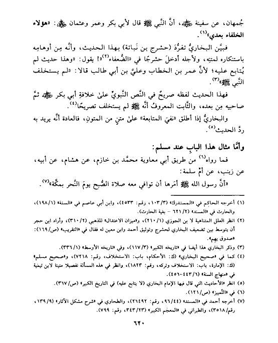 فبيَّن البخاريُّ تفرُّدَ (حشرج بن نَباتة) بهذا الحديث، وأنَّه مِن أوهامِه باستنكاره لمتنِه، ولأجله أدخلَ حشرجًا في «الضُّعفاء (¬٢) «! يقول: «وهذا حديث لم يُتابع عليه؛ لأنَّ عمر بن الخطاب وعليَّ بن أبي طالب قالا: «لم يستخلف النَّبي صلى الله عليه وسلم» (¬٣).