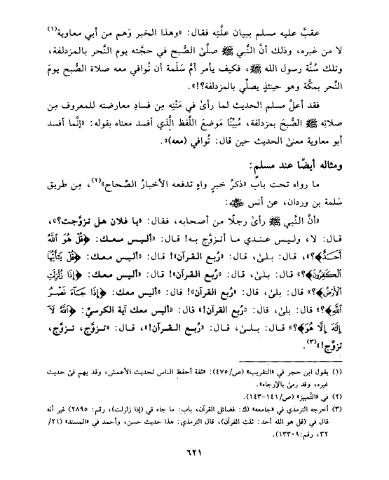 عقبَّ عليه مسلم ببيان علَّتِه فقال: «وهذا الخبر وَهم من أبي معاوية (¬١) لا من غيره، وذلك أنَّ النَّبي صلى الله عليه وسلم صلَّى الصُّبح في حجَّته يوم النَّحر بالمزدلفة، وتلك سُنَّة رسول الله صلى الله عليه وسلم، فكيف يأمر أمَّ سَلَمة أن تُوافي معه صلاة الصُّبح يومَ النَّحر بمكَّة وهو حينئذٍ يصلِّي بالمزدلفة؟!».