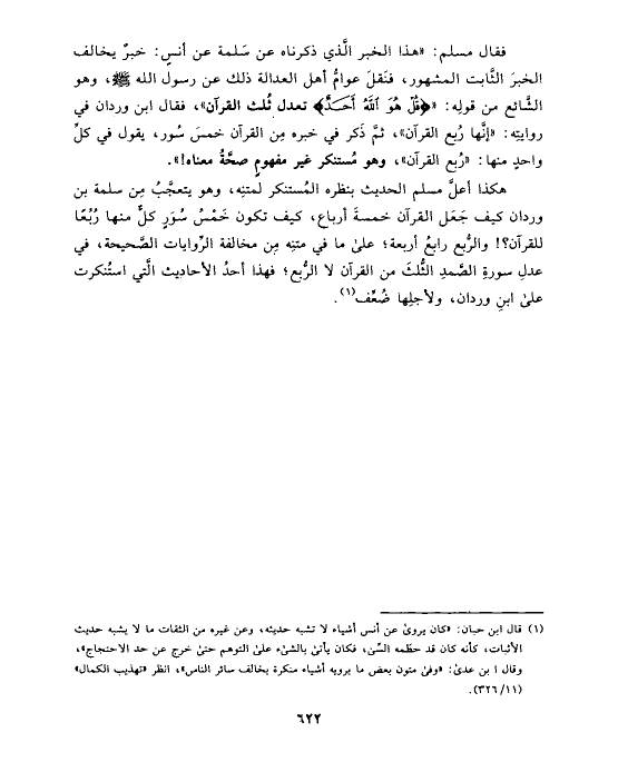 فقال مسلم: «هذا الخبر الَّذي ذكرناه عن سَلمة عن أنسٍ: خبرٌ يخالف الخبرَ الثَّابت المشهور، فنَقلَ عوامُّ أهل العدالة ذلك عن رسول الله صلى الله عليه وسلم، وهو الشَّائع من قولِه: «{قُلْ هُوَ اللَّهُ أَحَدٌ} تعدل ثُلث القرآن»، فقال ابن وردان في روايتِه: «إنَّها رُبع القرآن»، ثمَّ ذَكر في خبره مِن القرآن خمسَ سُور، يقول في كلِّ واحدٍ منها: «رُبع القرآن»، وهو مُستنكر غير مفهومٍ صحَّةُ معناه!».