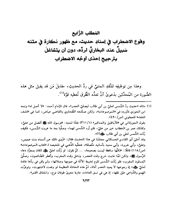 (¬١) مثاله «حديث ردِّ الشَّمس لعليِّ بن أبي طالب ليصليَّ العصر»، قال الإمام أحمد: «لا أصل له» وتبعه ابن الجوزي فأورده في «الموضوعات»، ولكن صحَّحه الطَّحاوي والقاضي عياض، كما في «كشف الخفاء» للعجلوني (ص/٤٩٠).