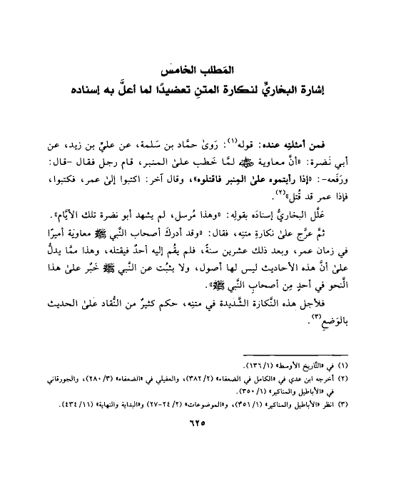 ثمَّ عرَّج على نكارةِ متنِه، فقال: «وقد أدركَ أصحاب النَّبي صلى الله عليه وسلم معاوية أميرًا في زمان عمر، وبعد ذلك عشرين سنةً، فلم يقُم إليه أحدٌ فيقتله، وهذا ممَّا يدلُّ على أنَّ هذه الأحاديث ليس لها أصول، ولا يثبُت عن النَّبي صلى الله عليه وسلم خَبرٌ على هذا الَّنحو في أحدٍ مِن أصحابِ النَّبي صلى الله عليه وسلم».