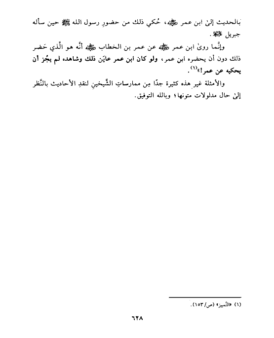 وإنَّما روى ابن عمر رضي الله عنه عن عمر بن الخطاب رضي الله عنه أنَّه هو الَّذي حَضر ذلك دون أن يحضره ابن عمر، ولو كان ابن عمر عايَن ذلك وشاهده لم يجُز أن يحكيه عن عمر!» (¬١).