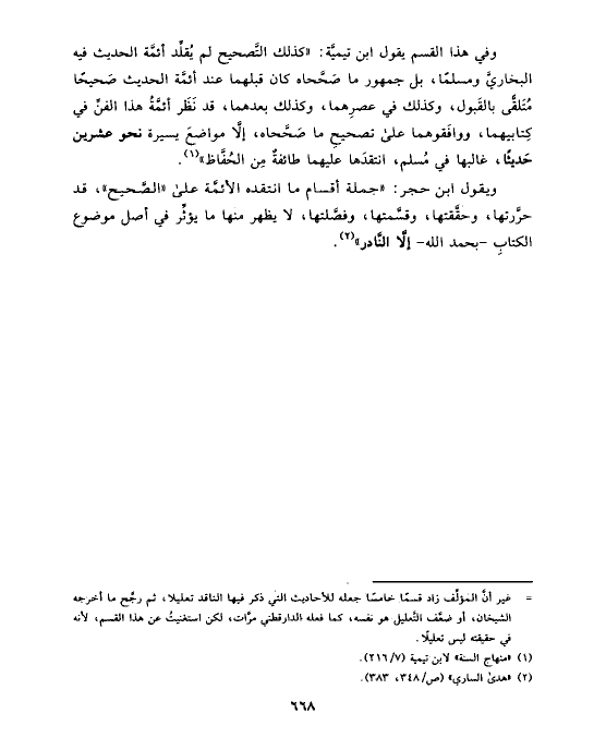 وفي هذا القسم يقول ابن تيميَّة: «كذلك التَّصحيح لم يُقلِّد أئمَّة الحديث فيه البخاريَّ ومسلمًا، بل جمهور ما صَحَّحاه كان قبلهما عند أئمَّة الحديث صَحيحًا مُتَلقًّى بالقَبول، وكذلك في عصرِهما، وكذلك بعدهما، قد نَظَر أئمَّةُ هذا الفنِّ في كِتابيهما، ووافَقوهما على تصحيحِ ما صَحَّحاه، إلَّا مواضعَ يسيرة نحو عشرين حَديثًا، غالبها في مُسلم، انتقدَها عليهما طائفةٌ مِن الحُفَّاظ» (¬١).
