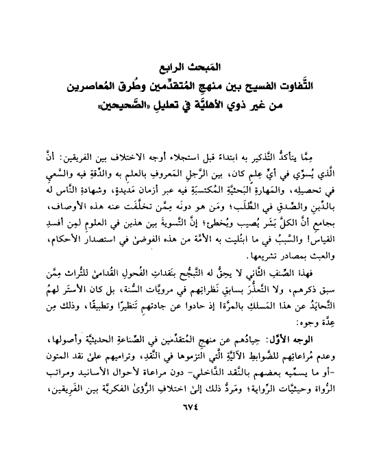 الوجه الأوَّل: حِيادُهم عن منهجِ المُتقدِّمين في الصِّناعةِ الحديثيَّة وأصولها، وعدم مُراعاتِهم للضَّوابطِ الآليَّةِ الَّتي التزموها في النَّقدِ، وتراميهم على نقد المتون -أو ما يسمِّيه بعضهم بالنَّقد الدَّاخلي- دون مراعاة لأحوال الأسانيد ومراتب الرُّواة وحيثيَّات الرِّواية؛ ومَردُّ ذلك إلى اختلافِ الرُّؤى الفكريَّة بين الفَرِيقين،