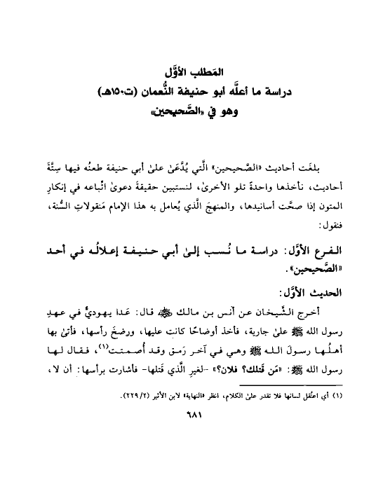 الفرع الأوَّل: دراسة ما نُسب إلى أبي حنيفة إعلالُه في أحد «الصَّحيحين».