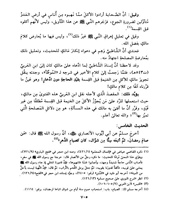 وقد لاحظنا أنَّ إسنادَ الشَّاطبيِّ لِما ادَّعاه على مالكٍ كان إلى ابنِ العَربيِّ (ت ٥٤٣ هـ)، فلمَّا رَجعتُ إلى كلامِ الأخير في شرحِه لـ «المُوطَّأ»، وجدته ينقُل تجويزَ مالكٍ للأكلِ مِن الغنيمةِ قبل القِسمة بقيْدِ الحاجةِ دون ادِّخارٍ! وهو عَينُ ما قرَّرناه آنفًا مِن كلامِ مالكٍ!