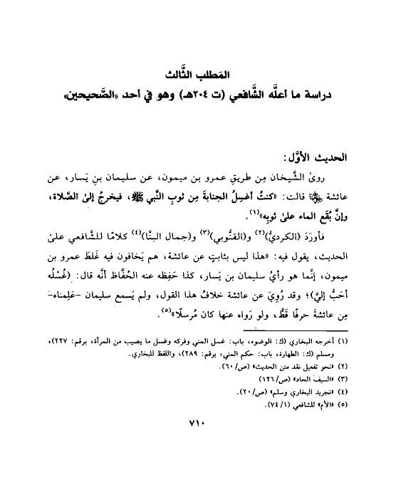فأورَدَ (الكرديُّ) (¬٢) و (القنُّوبي) (¬٣) و (جمال البنَّا) (¬٤) كلامًا للشَّافعي على الحديث، يقول فيه: «هذا ليس بثابتٍ عن عائشة، هم يَخافون فيه غَلطَ عمرو بن ميمون، إنَّما هو رأيُ سليمان بن يَسار، كذا حَفِظه عنه الحُفَّاظ أنَّه قال: (غُسْلُه أحَبُّ إليَّ)؛ وقد رُوِيَ عن عائشة خلافُ هذا القول، ولم يَسمع سليمان -عَلِمناه- مِن عائشةَ حرفًا قَطُّ، ولو رَواه عنها كان مُرسلًا» (¬٥).