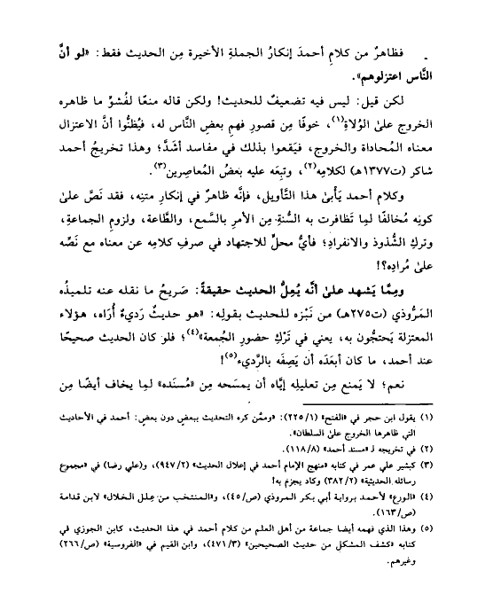 وكلام أحمد يَأْبى هذا التَّأويل، فإنَّه ظاهرٌ في إنكارِ متنِه، فقد نَصَّ على كونِه مُخالفًا لمِا تَظافرت به السُّنةِ مِن الأمرِ بالسَّمع، والطَّاعة، ولزومِ الجماعةِ، وتركِ الشُّذوذ والانفرادِ؛ فأيُّ محلٍّ للاجتهاد في صرفِ كلامِه عن معناه مع نَصِّه على مُرادِه؟!