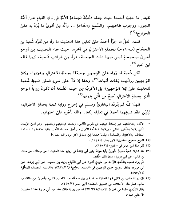 قلت: لعلَّ ما جَرَّأَ أحمدَ على تعليلِ هذا الحديث ما رآه من تَفرُّد شُعبة بن الحجَّاج (ت ١٦٠ هـ) بجملةِ الاعتزالِ في آخرِه، حيث جاء الحديث مِن أوجهٍ أخرى صحيحةٍ ليس فيها تلك الجملة، فرآه مِن غرائب شُعبة، كما قاله ابن حَجر (¬٢).