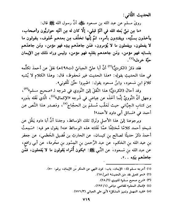 وقد أحالَ (الكرديُّ) هذا النَّقلَ إلى النَّووي في شرحِه لـ «صحيح مسلم» (¬٣)، وجهل أنَّ النَّوويَّ إنَّما أخَذَه عن عِياضٍ في شَرحِه «الإكمال» (¬٤)، الَّذي نَقَله بدَورِه مِن كتابِ الجِيَّاني حيث تَعَقَّب مُسلمَ بن الحجَّاج (¬٥)، ومَصدر هذا النَّص عن أحمد في «مَسائل أبي داود لأحمد»!