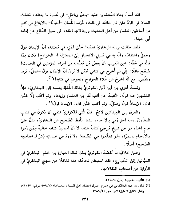 ولستُ أدري مِن أين أتَى الكوثريُّ بذاك اللَّفظِ ينسبه إلى البخاريِّ، فإنَّ المَشهورَ عنه قولُه: «كَتَبتُ عن ألفِ نَفرٍ مِن العلماءِ وزيادة، ولم أكتُب إلَّا عَمَّن قال: الإيمانُ قولٌ وعمَلٌ، ولم أكتب عَمَّن قال: الإيمان قولٌ» (¬٢).