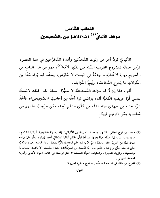 الألبانيُّ لونٌ آخر من رتوت المُحدِّثين وأفذاذ المُخرِّجين في هذا العصر، كرَّس حياتَه لمشروعِ «تقريب السُّنةِ بين يَدَي الأمَّة» (¬٢)، فهو في هذا البابِ من التَّخريجِ نهاية لا تُقارَب، وهمَّةٌ في البحث لا تعُارَض، يحشُد لمِا يَراه حَقًّا مِن النُّقولاتِ ما يُحرِج المُخالفَ، ويُبهِرُ المُؤالِف.