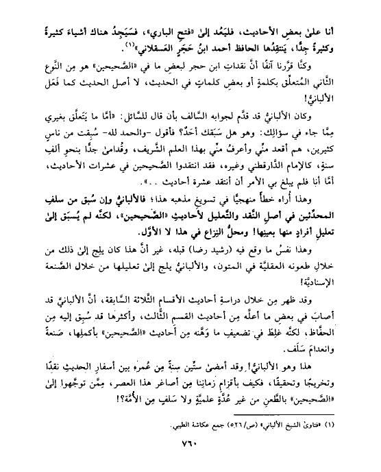 هذا وهو الألبانيُّ! وقد أمضى ستِّين سنةً مِن عُمره بين أسفارِ الحديثِ نقدًا وتخريجًا وتحقيقًا، فكيف بأقزامِ زمانِنا مِن أصاغر هذا العصر، مِمَّن توجَّهوا إلى «الصَّحيحين» بالطَّعنِ من غير عُدَّةٍ علميَّةٍ ولا سَلفٍ مِن الأُمَّة؟!
