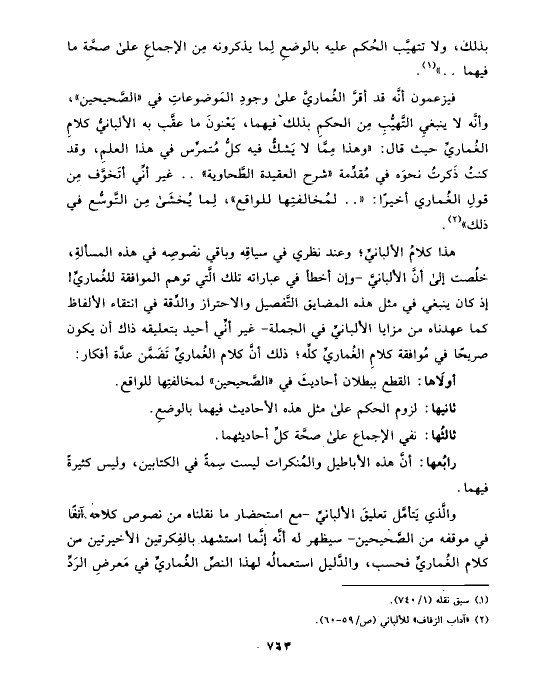 والَّذي يَتأمَّل تعليقَ الألبانيِّ -مع استحضار ما نقلناه من نصوص كلامه آنفًا في موقفه من الصَّحيحين- سيظهر له أنَّه إنَّما استشهد بالفِكرتين الأخيرتين من كلام الغُماريِّ فحسب، والدَّليل استعمالُه لهذا النصِّ الغُماريِّ في مَعرضِ الرَدِّ