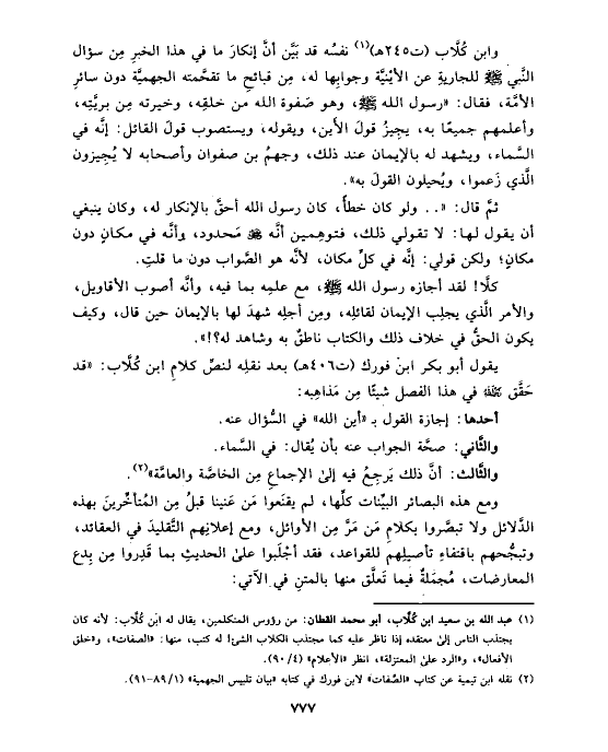 يقول أبو بكر ابن فورك (ت ٤٠٦ هـ) بعد نقلِه لنصِّ كلامِ ابن كُلَّاب: «قد حَقَّق رحمه الله في هذا الفصل شيئًا مِن مَذاهِبه: