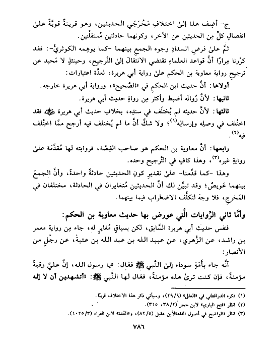 ثمَّ على فرضِ انسدادِ وجوه الجمعِ بينهما -كما يوهِمه الكوثريُّ-: فقد كرَّرنا مِرارًا أنَّ قواعد العلماءِ تقتضي الانتقالَ إلى التَّرجيح، وحينئذٍ لا مَحيد عن ترجيحِ رواية معاوية بن الحكم على رواية أبي هريرة، لعدَّة اعتبارات: