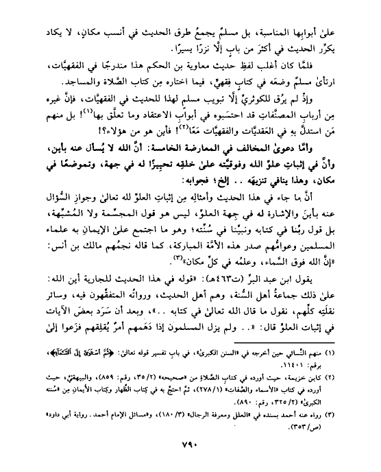 يقول ابن عبد البرِّ (ت ٤٦٣ هـ): «قوله في هذا الحديث للجارية أين الله: على ذلك جماعةُ أهل السُّنة، وهم أهل الحديث، ورواتُه المتفقِّهون فيه، وسائر نقلَتِه كلِّهم، نقول ما قال الله تعالى في كتابه .. »، وبعد أن سَرَد بعضَ الآيات في إثبات العلوِّ قال: « .. ولم يزل المسلمون إذا دَهَمهم أمرٌ يُقلِقهم فزَعوا إلى