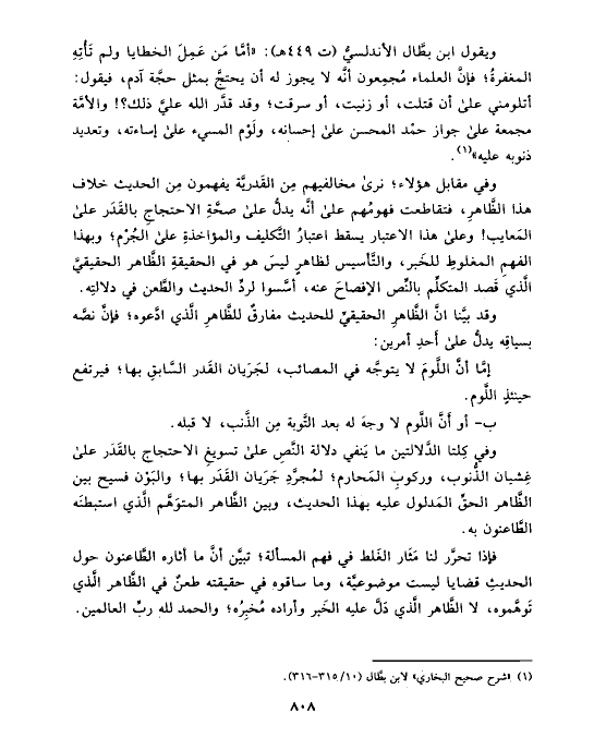 ويقول ابن بطَّال الأندلسيُّ (ت ٤٤٩ هـ): «أمَّا مَن عَمِلَ الخطايا ولم تَأْتِهِ المغفرةُ؛ فإنَّ العلماء مُجمِعون أنَّه لا يجوز له أن يحتجَّ بمثل حجَّة آدم، فيقول: أتلومني على أن قتلت، أو زنيت، أو سرقت؛ وقد قدَّر الله عليَّ ذلك؟! والأمَّة مجمعة على جواز حمْد المحسن على إحسانه، ولَوْم المسيء على إساءته، وتعديد ذنوبه عليه» (¬١).