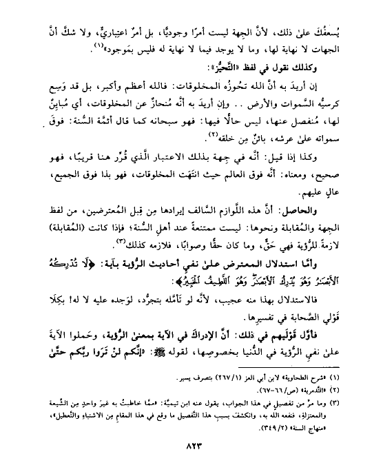 وكذا إذا قيل: أنَّه في جِهة بذلك الاعتبار الَّذي قُرِّر هنا قريبًا، فهو صحيح، ومعناه: أنَّه فوق العالم حيث انتَهَت المخلوقات، فهو بذا فوق الجميع، عالٍ عليهم.