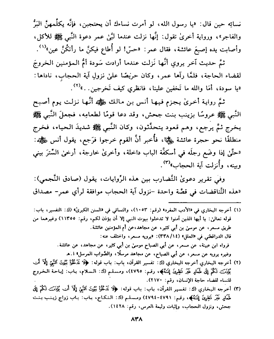 (¬٢) أخرجه البخاري أخرجه البخاري (ك: تفسير القرآن، باب: باب قوله: {لا تَدْخُلُوا بُيُوتَ النَّبِيِّ إِلَاّ أَن يُؤْذَنَ لَكُمْ إِلَى طَعَامٍ غَيْرَ نَاظِرِينَ إِنَاهُ}، رقم: ٤٧٩٥)، ومسلم (ك: السلام، باب: إباحة الخروج للنساء لقضاء حاجة الإنسان، رقم: ٢١٧٠).