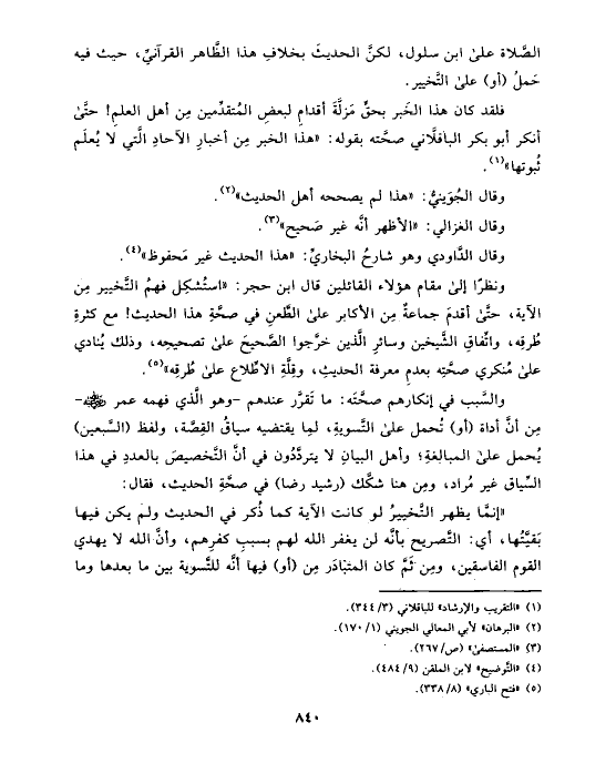 والسَّبب في إنكارهم صحَّتَه: ما تَقرَّر عندهم -وهو الَّذي فهمه عمر رضي الله عنه- مِن أنَّ أداة (أو) تُحمل على التَّسويةِ، لمِا يقتضيه سياقُ القِصَّة، ولفظ (السَّبعين) يُحمل على المبالغةِ؛ وأهل البيانِ لا يتردَّدُون في أنَّ التَّخصيصَ بالعددِ في هذا السِّياق غير مُراد، ومِن هنا شكَّك (رشيد رضا) في صحَّةِ الحديث، فقال: