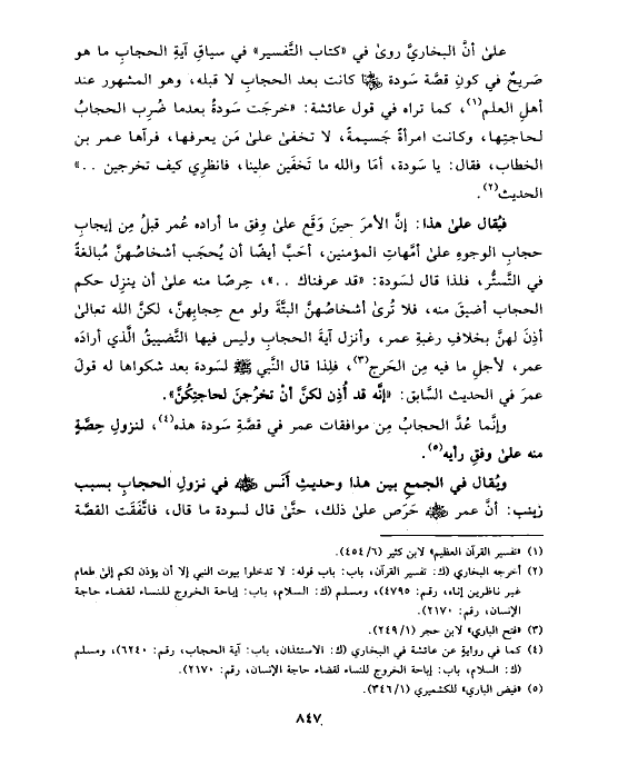 (¬٤) كما في روايةٍ عن عائشة في البخاري (ك: الاستئذان، باب: آية الحجاب، رقم: ٦٢٤٠)، ومسلم (ك: السلام، باب: إباحة الخروج للنساء لقضاء حاجة الإنسان، رقم: ٢١٧٠).