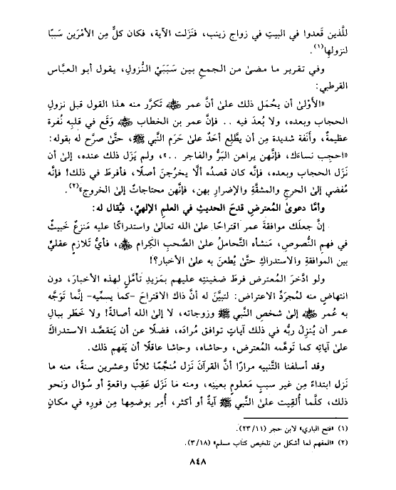 ولو ادَّخرَ المُعترض فرطَ ضغينتِه عليهم بمَزيدِ تأمَّلٍ لهذه الأخبارَ، دون انتهاضٍ منه لمُجرَدِّ الاعتراض: لتبيَّنَ له أنَّ ذاك الاقتراحَ -كما يسمِّيه- إنَّما تَوَجَّه به عُمر رضي الله عنه إلى شخصِ النَّبي صلى الله عليه وسلم وزوجاته، لا إلى الله أصالةً! ولا خَطَر ببالِ عمر أن يُنزِلَ ربُّه في ذلك آياتٍ توافق مُرادَه، فضلًا عن أن يَتقصَّد الاستدراكَ على آياتِه كما تَوهَّمه المُعترض، وحاشاه، وحاشا عاقلًا أن يَفهم ذلك.