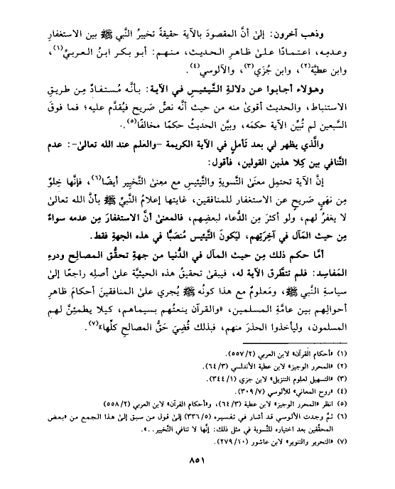 وذهب آخرون: إلى أنَّ المقصودَ بالآية حقيقةً تخييرُ النَّبي صلى الله عليه وسلم بين الاستغفارِ وعدمِه، اعتمادًا على ظاهرِ الحديث، منهم: أبو بكر ابنُ العربيِّ (¬١)، وابن عطيَّة (¬٢)، وابن جُزَي (¬٣)، والآلوسي (¬٤).