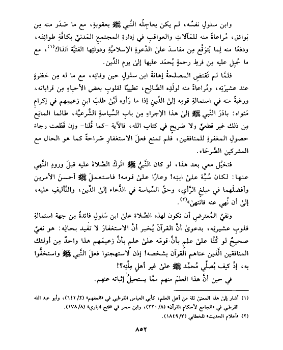 فتخيَّل معي بعد هذا، لو كان النَّبيُّ صلى الله عليه وسلم «تَركَ الصَّلاةَ عليه قبلَ ورودِ النَّهي عنها: لكان سُبَّة على ابنِه! وعارًا على قومه! فاستعملَ صلى الله عليه وسلم أحسنَ الأمرين وأفضلَهما في مبلغِ الرَّأي، وحقِّ السِّياسة في الدُّعاء إلى الدِّين، والتَّأليفِ عليه، إلى أن نُهي عنه فانتهى» (¬٢).