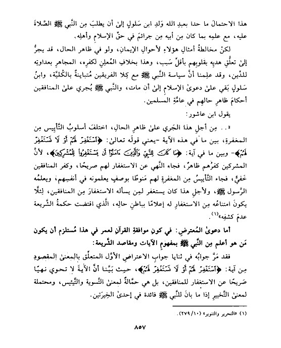 « .. مِن أجلِ هذا الجَري على ظاهرِ الحالِ، اختلفَ أسلوبُ التَّأيِيس مِن المغفرةِ، بين ما في هذه الآية -يعني قولَه تعالى: {اسْتَغْفِرْ لَهُمْ أَوْ لَا تَسْتَغْفِرْ لَهُمْ} - وبين ما في آية: {مَا كَانَ لِلنَّبِيِّ وَالَّذِينَ آمَنُوا أَن يَسْتَغْفِرُوا لِلْمُشْرِكِينَ}، لأنَّ المشركين كفرُهم ظاهرٌ، فجاء النَّهي عن الاستغفار لهم صريحًا، وكفر المنافقين خَفيٌّ، فجاء التَّأييسُ مِن المغفرةِ لهم مَنوطًا بوصفٍ يعلمونه في أنفسِهم، ويعلمُه الرَّسول صلى الله عليه وسلم، ولأجلِ هذا كان يستغفر لمِن يسأله الاستغفارَ مِن المنافقين، لِئلَّا يكونَ امتناعُه مِن الاستغفارِ له إعلامًا بباطنِ حالِه، الَّذي اقتضت حكمةُ الشَّريعة عدمَ كشفِه» (¬١).