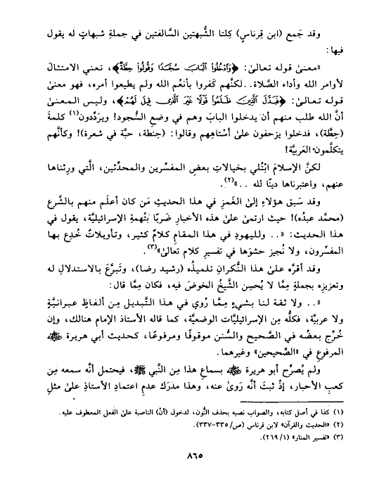 « .. ولا ثقة لنا بشيءٍ مِمَّا رُوي في هذا التَّبديل مِن ألفاظٍ عبرانيَّةٍ ولا عربيَّة، فكلُّه مِن الإسرائيليَّات الوضعيَّة، كما قاله الأستاذ الإمام هنالك، وإن خُرِّج بعضُه في الصَّحيح والسُّنن موقوفًا ومرفوعًا، كحديث أبي هريرة رضي الله عنه المرفوعِ في «الصَّحيحين» وغيرهما.