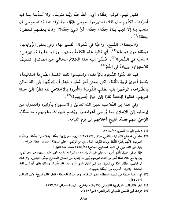 (¬٢) جاء في «مطالع الأنوار» للقاضي عياض (٢/ ٢٧٥): «رواه المروزي: حِطَّة، بدلا من: حِنْطَة، وبالنُّون أصوب؛ لأنَّهم بدَّلوا اللَّفظ بزيادة النُّون، كما روي من قولهم: حِطى سمهاثا، معناه: حنطة حمراء».