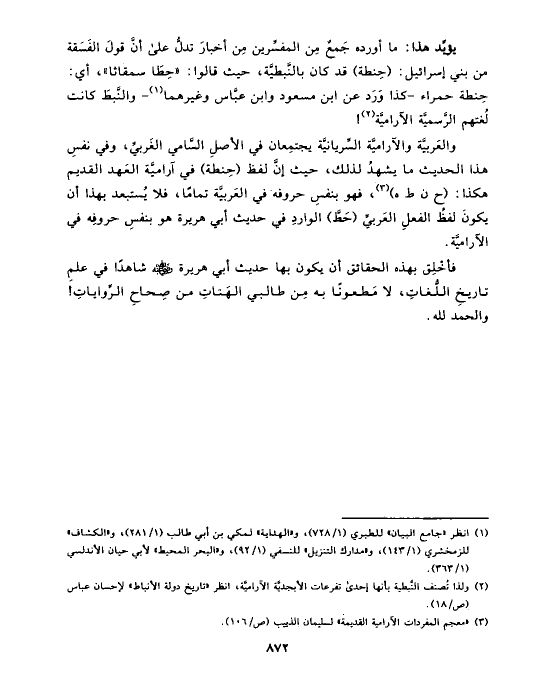 والعَربيَّة والآراميَّة السِّريانيَّة يجتمِعان في الأصلِ السَّامي الغَربيِّ، وفي نفسِ هذا الحديث ما يشهدُ لذلك، حيث إنَّ لفظ (حِنطة) في آراميَّة العَهد القديم هكذا: (ح ن ط ه) (¬٣)، فهو بنفسِ حروفه في العَربيَّة تمامًا، فلا يُستبعد بهذا أن يكونَ لفظُ الفعلِ العَربيِّ (حَطَّ) الواردِ في حديث أبي هريرة هو بنفسِ حروفِه في الآراميَّة.