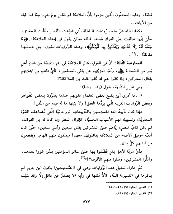 فكفانا الله شرَّ هذه الرِّوايات الباطلة الَّتي شوَّهت التَّفسير وقَلَبت الحقائق، حتَّى إنَّها خالفت نصَّ القرآن نفسه، فالله تعالى يقول في إمداد الملائكة: {وَمَا جَعَلَهُ اللَّهُ إِلَاّ بُشْرَى وَلِتَطْمَئِنَّ بِهِ قُلُوبُكُمْ}، وهذه الرِّوايات تقول: بل جعلَها مقاتلةً! .. » (¬١).