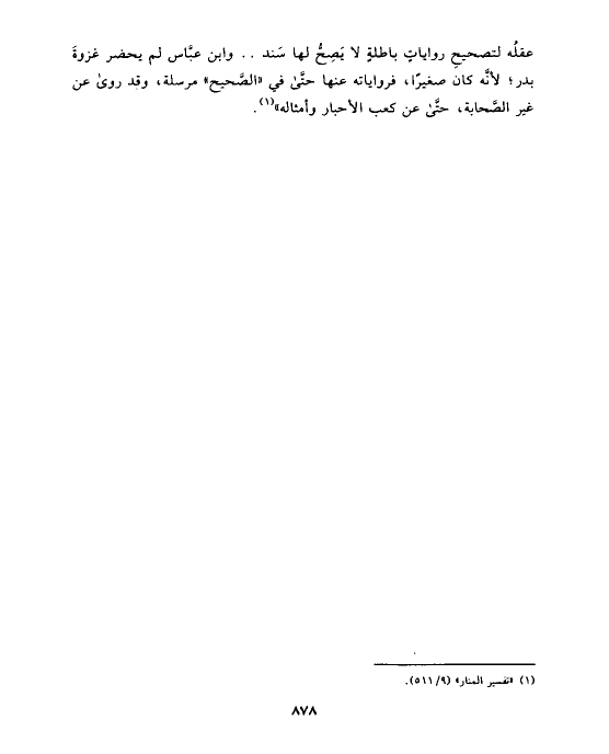 عقلُه لتصحيحِ رواياتٍ باطلةٍ لا يَصِحُّ لها سَند .. وابن عبَّاس لم يحضر غزوةَ بدر؛ لأنَّه كان صغيرًا، فرواياته عنها حتَّى في «الصَّحيح» مرسلة، وقد روى عن غير الصَّحابة، حتَّى عن كعب الأحبار وأمثاله» (¬١).