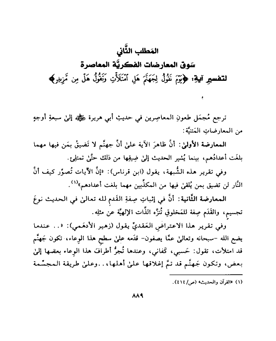 وفي تقرير هذه الشُّبهة، يقول (ابن قرناس): «إنَّ الآيات تُصوِّر كيف أنَّ النَّار لن تضيق بمن يُلقى فيها من المكذِّبين مهما بلغت أعدادهم» (¬١).