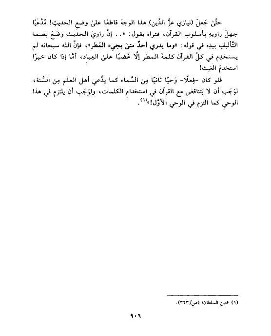 فلو كان -فِعلًا- وَحيًا ثانيًا مِن السَّماء كما يدَّعي أهل العلم مِن السُّنة، لوَجَب أن لا يَتناقض مع القرآن في استخدامِ الكلمات، ولوَجَب أن يلتزم في هذا الوحيِ كما التزم في الوحي الأوَّل!» (¬١).