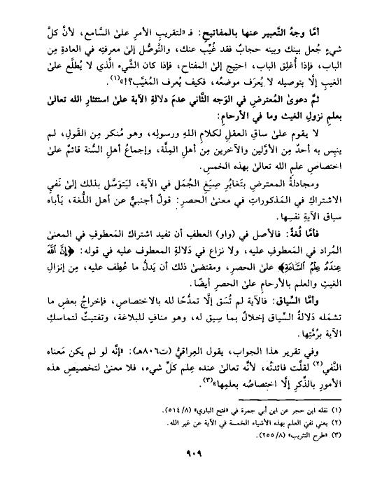 وفي تقرير هذا الجواب، يقول العِراقيُّ (ت ٨٠٦ هـ): «إنَّه لو لم يكن مَعناه النَّفي (¬٢) لقلَّت فائدتُه، لأنَّه تعالى عنده عِلم كلِّ شيء، فلا معنى لتخصيصِ هذه الأمورِ بالذِّكرِ إلَّا اختصاصُه بعلمِها» (¬٣).