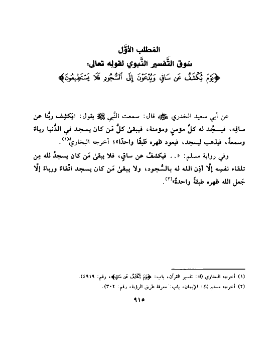 المَطلب الأوَّل سَوق التَّفسير النَّبوي لقولِه تعالى: {يَوْمَ يُكْشَفُ عَن سَاقٍ وَيُدْعَوْنَ إِلَى السُّجُودِ فَلا يَسْتَطِيعُونَ}
