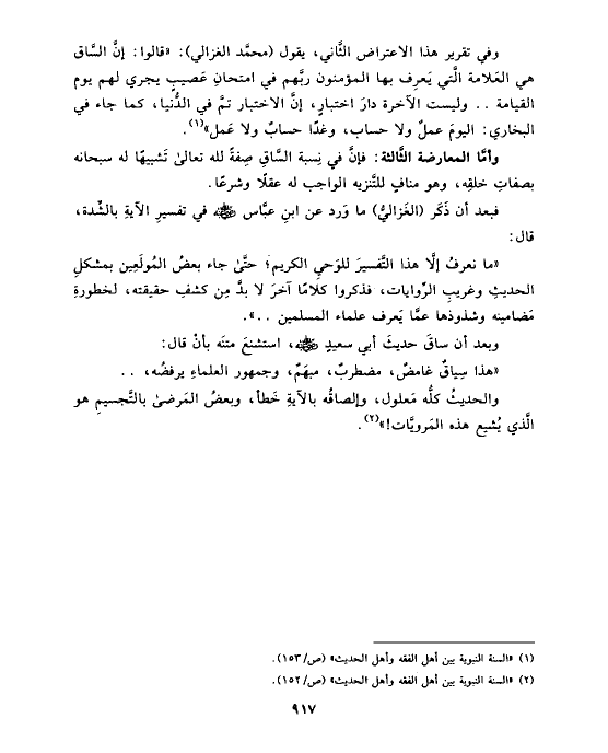 وفي تقرير هذا الاعتراض الثَّاني، يقول (محمَّد الغزالي): «قالوا: إنَّ السَّاق هي العَلامة الَّتي يَعرِف بها المؤمنون ربَّهم في امتحانِ عَصيبٍ يجري لهم يوم القيامة .. وليست الآخرة دارَ اختبارٍ، إنَّ الاختبار تمَّ في الدُّنيا، كما جاء في البخاري: اليومَ عملٌ ولا حساب، وغدًا حسابٌ ولا عَمل» (¬١).