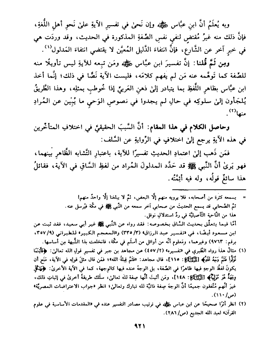 ومِن ثَمَّ قُلنا: إنَّ تفسيرَ ابن عبَّاس رضي الله عنه ومَن تبِعه للآيةِ ليس تأويلًا منه للصِّفة كما تَوهَّمه عنه مَن لم يفهم كلامَه، فليست الآية نَصًّا في ذلك؛ إنَّما أخذ ابن عبَّاس بظاهرِ اللَّفظِ بما يتبادر إلى ذهنِ العَربيِّ إذا خُوطبِ بمثلِه، وهذا الطَّريقُ يُلجَأون إلى سلوكِه في حالِ لم يجدوا في نصوصِ الوَحيِ ما يُبِين عن المُرادِ منها (¬٢).