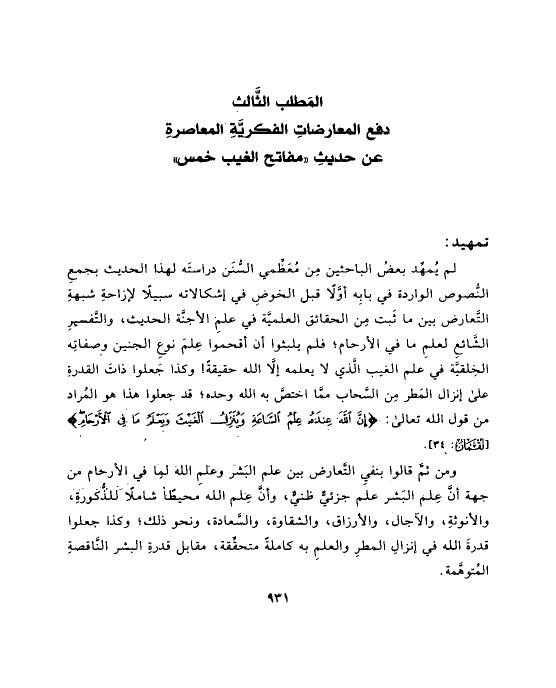 المَطلب الثَّالث دفع المعارضاتِ الفكريَّةِ المعاصرةِ عن حديثِ «مفاتح الغيب خمس»