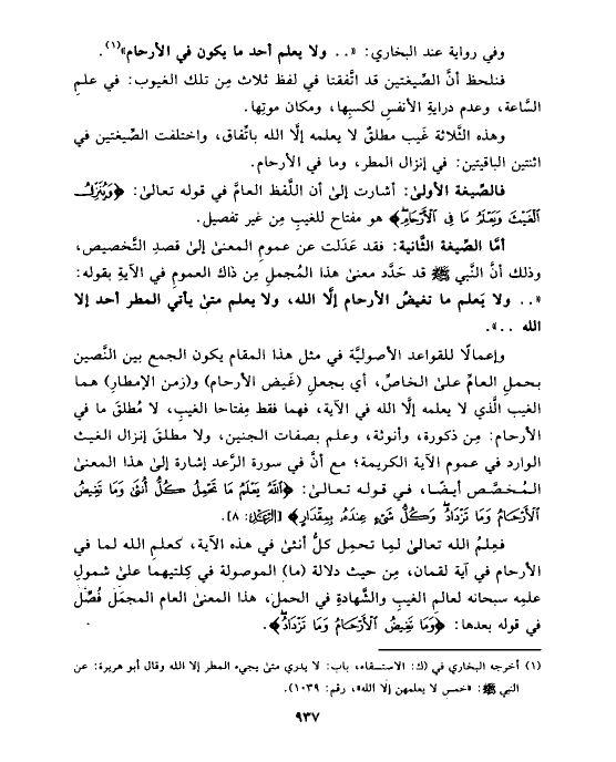 أمَّا الصِّيغة الثَّانية: فقد عَدَلت عن عمومِ المعنى إلى قصدِ التَّخصيص، وذلك أنَّ النَّبي صلى الله عليه وسلم قد حَدَّد معنى هذا المُجملِ مِن ذاك العمومِ في الآيةِ بقوله: « .. ولا يَعلم ما تغيضُ الأرحام إلَّا الله، ولا يعلم متى يأتي المطر أحد إلا الله .. ».