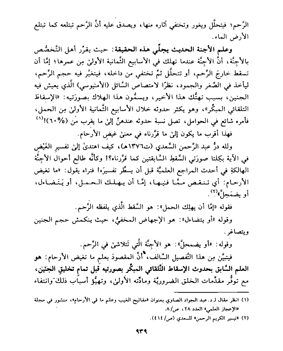 ولله درُّ عبد الرَّحمن السَّعدي (ت ١٣٧٦ هـ)، كيف اهتدى إلى تفسيرِ الغَيْضِ في الآية بكِلتا صورَتي السَّقطِ السَّابقتين كما قرَّرناه؟! وكأنَّه طالع أحوال الأجِنَّة الهالكةِ في أحدث المراجع العلميَّة قبل أن يسطِّر تفسيرَه! فتراه يقول: «ما تغيض الأرحام: أي تنقص ممَّا فيها، إمَّا أن يهلك الحمل، أو يَتَضاءل، أو يضمَحِلَّ» (¬٢).