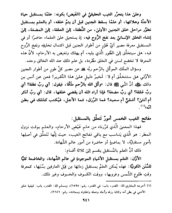 (¬١) أخرجه البخاري (ك: القدر، باب: في القدر، رقم: ٦٥٩٥)، ومسلم (ك: القدر، باب: كيفية خلق الآدمي في بطن أمه وكتابة رزقه وأجله وعمله وشقاوته وسعادته، رقم: ٢٦٤٦).