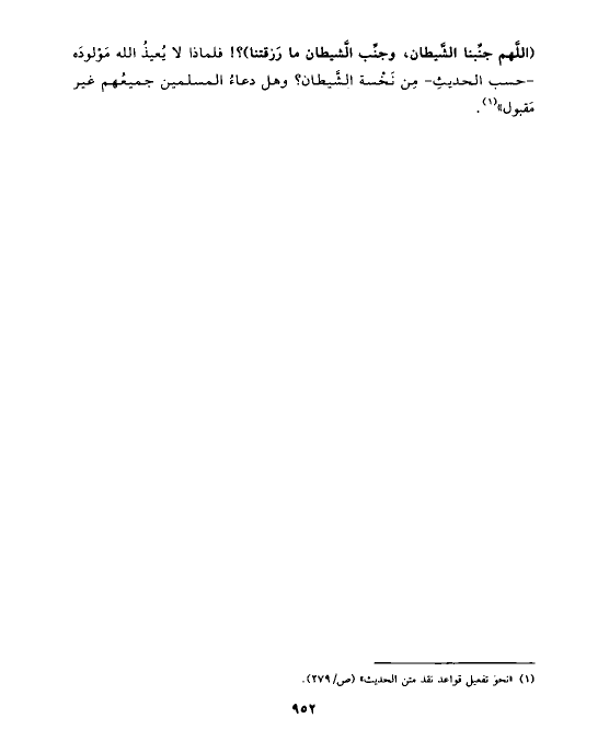 (اللَّهم جنِّبنا الشَّيطان، وجنِّب الَّشيطان ما رَزقتنا)؟! فلماذا لا يُعيذُ الله مَوْلودَه -حسب الحديثِ- مِن نَخْسة الشَّيطان؟ وهل دعاءُ المسلمين جميعُهم غير مَقبول» (¬١).