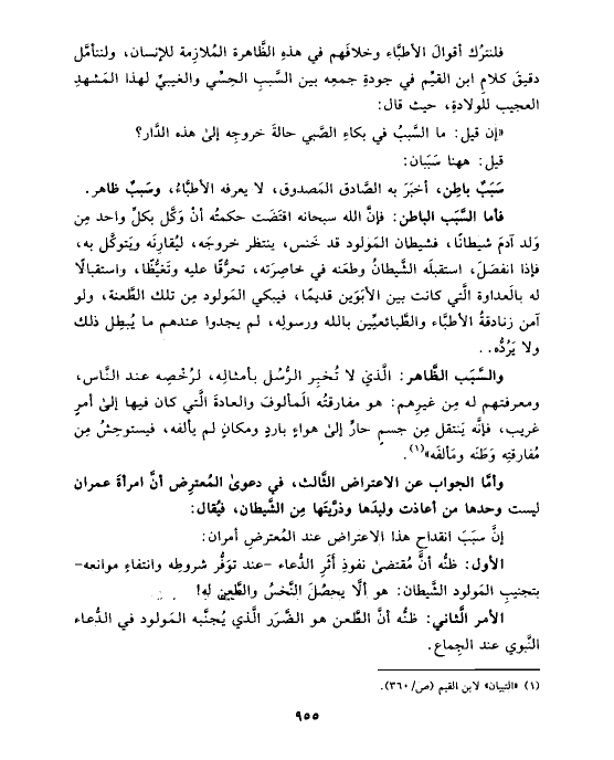 فأما السَّبَب الباطن: فإنَّ الله سبحانه اقتَضَت حكمتُه أنْ وَكَّل بكلِّ واحد مِن وَلد آدمَ شيطانًا، فشيطان المَولود قد خَنس، ينتظر خروجَه، ليُقارِنَه ويَتوكَّل به، فإذا انفصَلَ، استقبلَه الشَّيطانُ وطعَنه في خاصِرَته، تحرُّقًا عليه وتَغيُّظًا، واستقبالًا له بالَعداوة الَّتي كانت بين الأبَوَين قديمًا، فيبكي المَولود مِن تلك الطَّعنة، ولو آمن زنادقةُ الأطبَّاء والطَّبائعيِّين بالله ورسولِه، لم يجدوا عندهم ما يُبطِل ذلك ولا يَرُدُّه ..