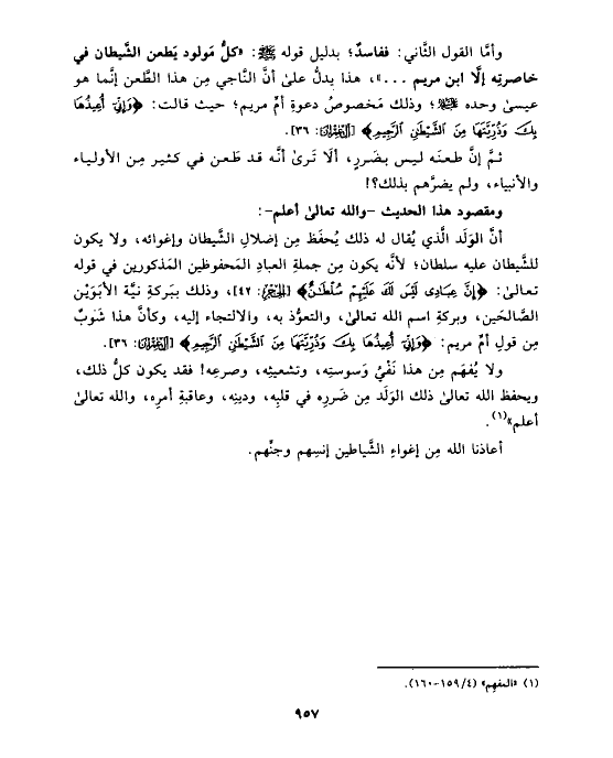 وأمَّا القول الثَّاني: ففاسدٌ؛ بدليل قوله صلى الله عليه وسلم: «كلُّ مَولود يَطعن الشَّيطان في خاصرتِه إلَّا ابن مريم ... »، هذا يدلُّ على أنَّ النَّاجي مِن هذا الطَّعن إنَّما هو عيسى وحده عليه السلام؛ وذلك مَخصوصُ دعوةِ أمِّ مريم؛ حيث قالت: {وِإِنِّي أُعِيذُهَا بِكَ وَذُرِّيَّتَهَا مِنَ الشَّيْطَانِ الرَّجِيمِ} [آل عمران: ٣٦].