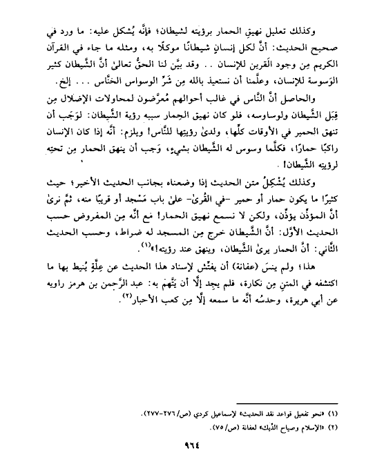 وكذلك يُشْكِلُ متن الحديث إذا وضعناه بجانب الحديث الأخير؛ حيث كثيرًا ما يكون حمار أو حمير -في القُرى- على باب مَسْجد أو قريبًا منه، ثمَّ نرى أنَّ المؤذِّن يؤذِّن، ولكن لا نسمع نهيق الحمار! مع أنَّه مِن المفروض حسب الحديث الأوَّل: أنَّ الشَّيطان خرج مِن المسجد له ضراط، وحسب الحديث الثَّاني: أنَّ الحمار يرى الشَّيطان، وينهق عند رؤيته!» (¬١).
