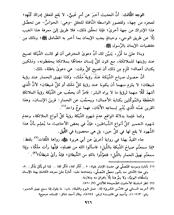 أنَّ حصول صياح الدِّيَكة عند رؤية مَلَك، وكذا نهيق الحمار عند رؤية شيطان؛ لا يلزم منهما أن يكونا عند رؤيةِ كلِّ مَلَك أو كلِّ شيطان؛ لأنَّ الَّذي أشهدَ كُلًّا منهما لرؤيةِ ما لا يراه البشر: قادرٌ أن يحجُب عن الدِّيَكة رؤيةَ الملائكةِ الحَفَظة والمُوكَّلين بكتابة الأعمال؛ ويحجُبَ عن الحمارِ: قرينَ الإنسان، وهذا القرين نفسُه الَّذي يُدْبِر لِسماعِه الأَذَان، فهما نوعٌ واحد (¬١).